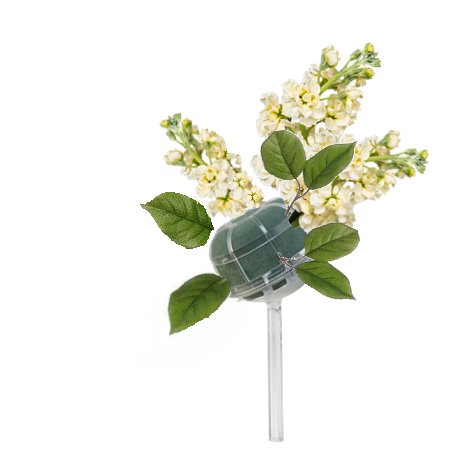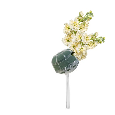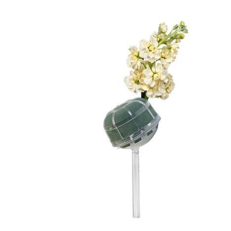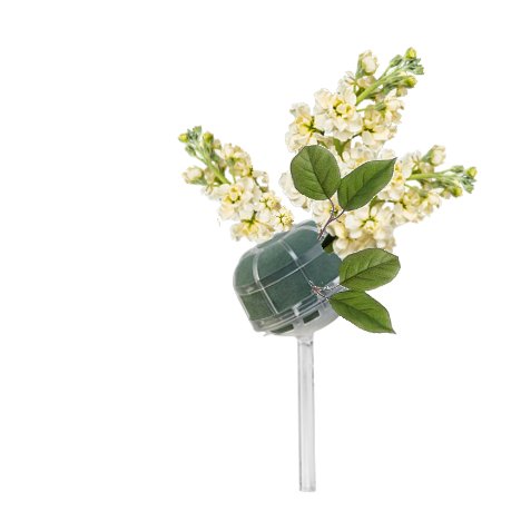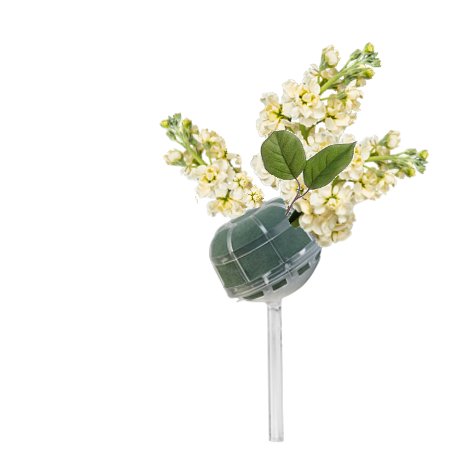 You can create a similar chair decoration starting with a Slant Handle Grande Belle Bouquet Holder. It's important to soak all florist foam with water that has been treated with professional flower food. Float soak the holder, allowing it to absorb water slowly and completely so there is no dry pockets left in the foam head.