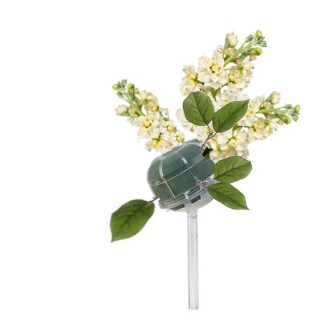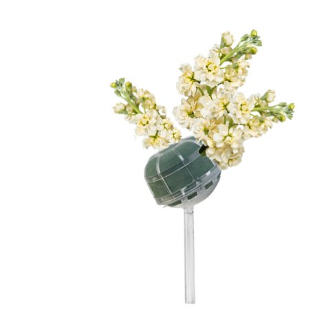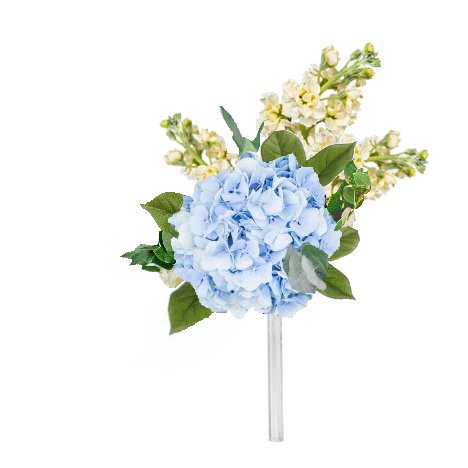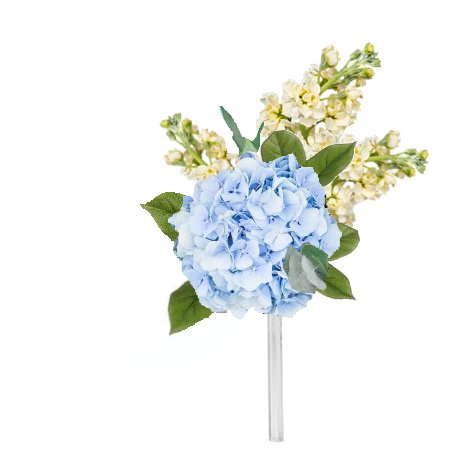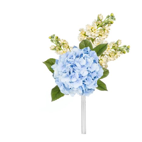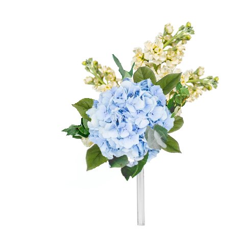 Cut the hydrangea stem short and on a diangle. Insert it deep into the direct center of the bouquet holder.
