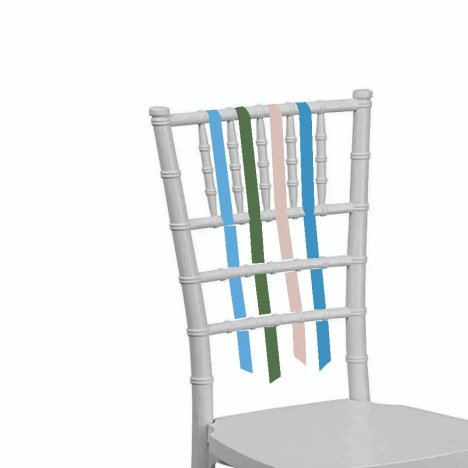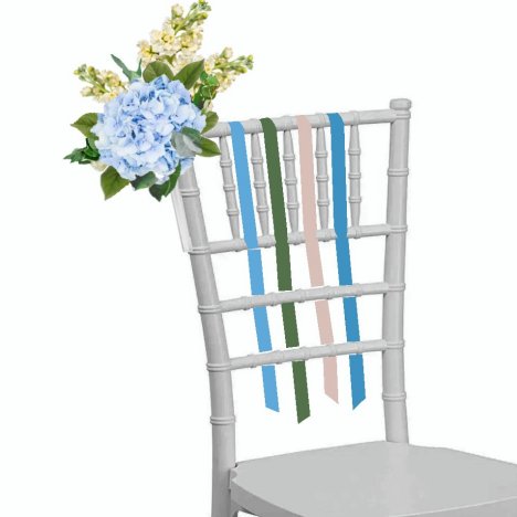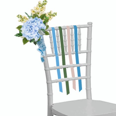 Prepare the chair by draping 1" double faced satin over the top of the back of the chair, and tied under the first lateral brace. Allow the ends of the contrasting ribbons to trail down behind the chair.