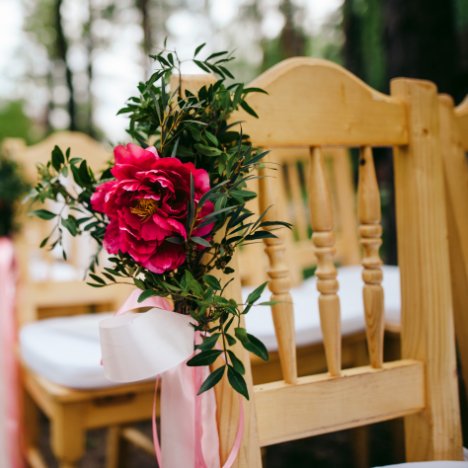 Wedding chair decorations made from fresh peonies need to have water tubes if you wish them to stay looking good. These lovely flowers droop quickly without a water source.