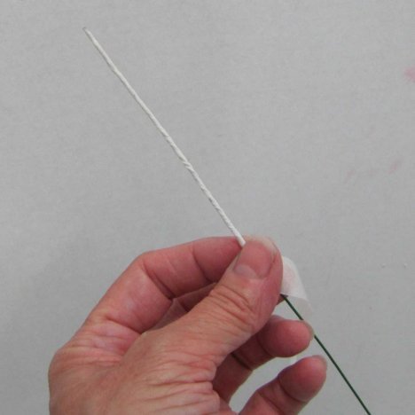 Tape two pieces of florist wire with white stem wrap. Twist this wire on both sides of the iglue, in the hole in the tabs. These wires will be used later to attach to the wedding chairs. If you wish, you can slip ribbon if you prefer through the hole tabs and use that to attach the wedding chair decorations.
