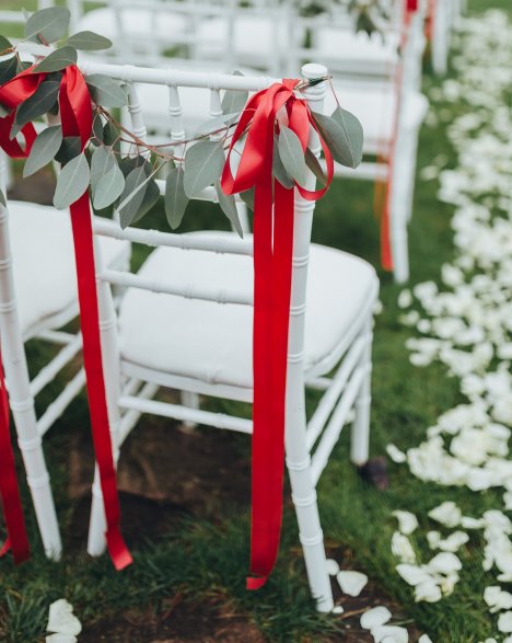 These wedding chair decorations are simple stems of seeded eucalyptus used as a swag on the back of the chairs for the wedding guests.