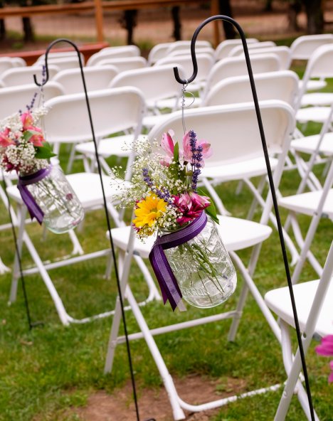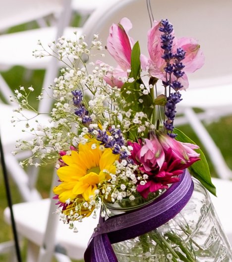 The bright assortment of casually arranged flowers make a beautiful aisle decoration for any outdoor wedding.