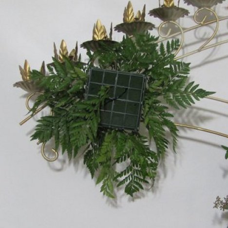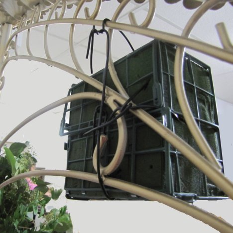 Wire the cage into place as you did with the oval wreath. Be sure it is tight and secure. Wet foam is heavy and can droop forward if you don't have it fitted tightly to the candelabra.