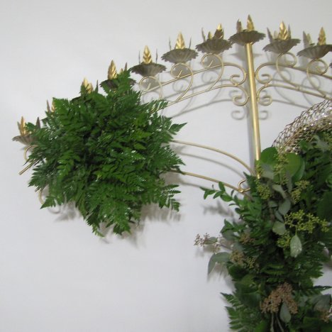 Now my candelabra is greened and ready for flowers. At this point, however, I'm going to add the elegance of a fabric drape to the design.