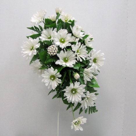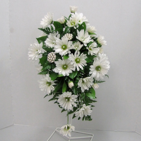A wedding daisy bouquet can be given a "touch of elegance" by adding some type of jewelry into the cascade. I love adding a touch of sparkle or the gleam of pearls to a bridal bouquet. It just adds a richness that turns simple daisies into pure elegance.
