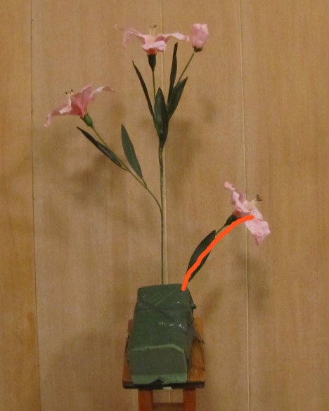 Insert another Asiatic lily, cutting a lateral of one of the longer stems and inserting it to the right and facing off to the side.