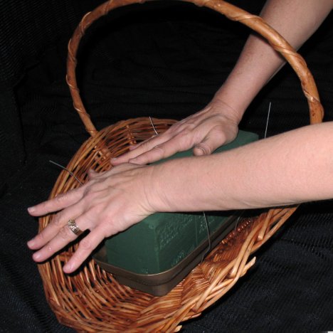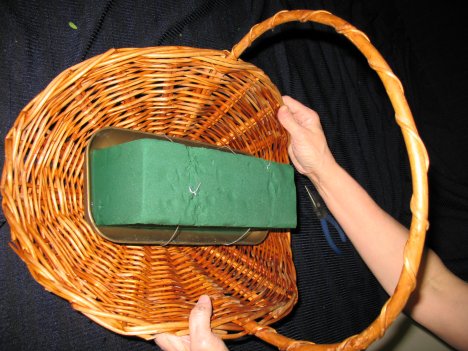 Since this is a large fireside basket, I'm inserting a total stem into one end of the florist foam. Angle upwards slightly, so the the leather points downward, spilling gracefully from the basket.