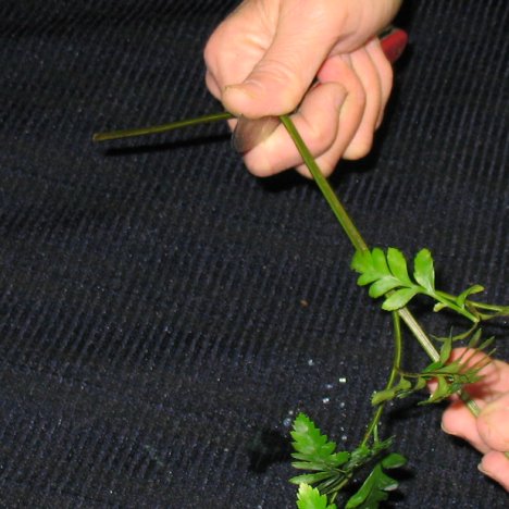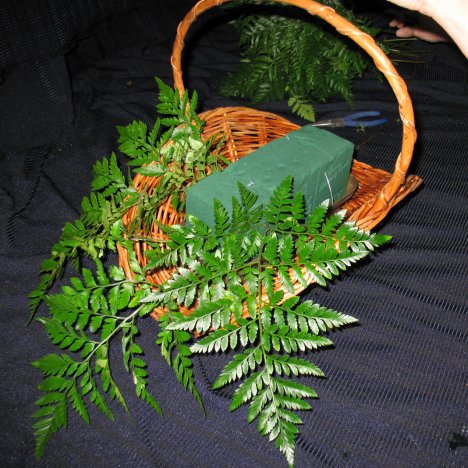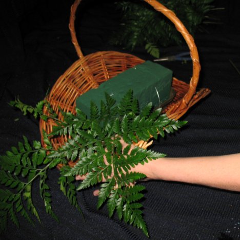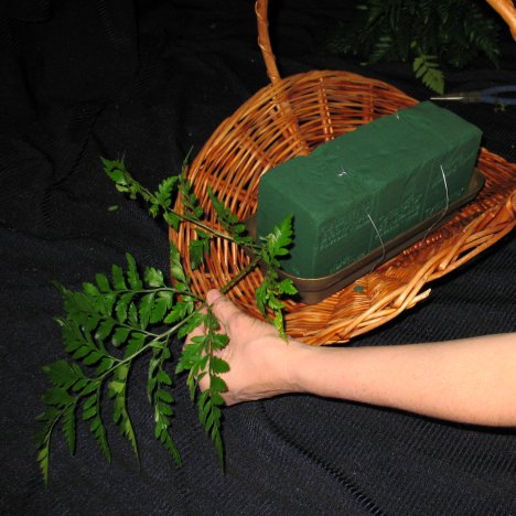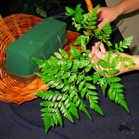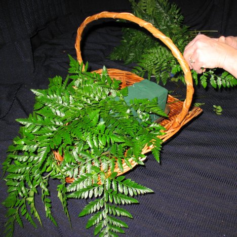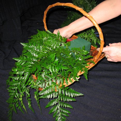 I'm going to begin greening with leather leaf fern. This versatile green is a staple in all flower shops.