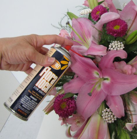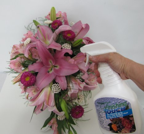 I mist all my flower designs with a flower sealant such as Finishing Touch. This is especially important for flowers that can't be stored in a professional florist coolers.