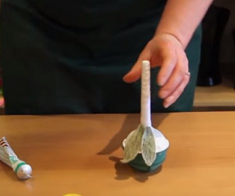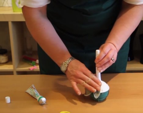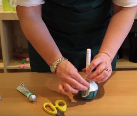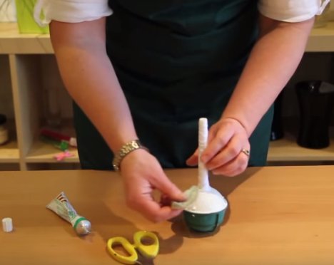 A professional florist generally conceals all mechanics of any design piece (this includes wire, green foam, plastic cages, etc.) She is gluing artificial leaves to the underside of the bouquet holder with floral adhesive.