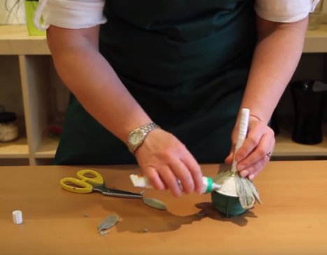You can see she takes a few moments to make sure all the leaves are firmly adhered before moving on to the next step.