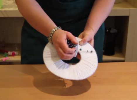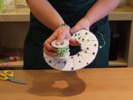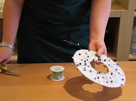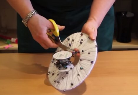 Wind the wire around the collar, from inside to around the outside, stopping to twist the wire still on the bolt around a pearl head on the cut end.