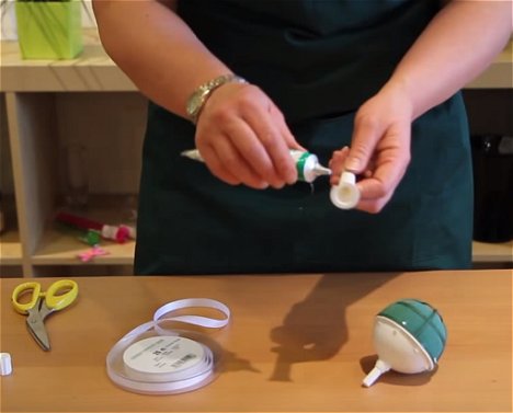 Carefully apply glue to the handle. Keep in mind a new tube is under pressure and a lot will come out if you squeeze too hard. Be prepared to push a pearl pin in immediately after each use. (This is easier than screwing a cap on and off repeatedly!)
