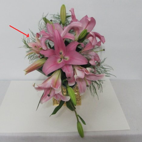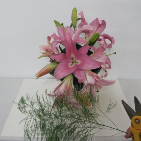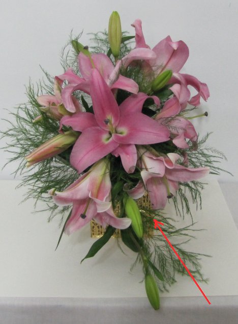 Just a few stems fill in and conceal the mechanics (the florist foam) of this bouquet. If you want less to show, fill the bouquet holder in first before adding the flowers and trim short. That way you'll cover the foam yet allow only blooms to show.
