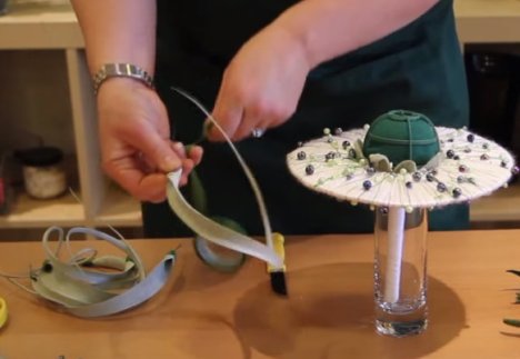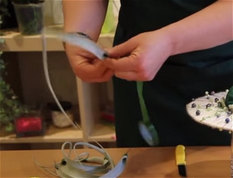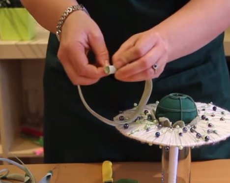 she inserts into the bouquet holder. Every designer is different. I would use wire and then tape.