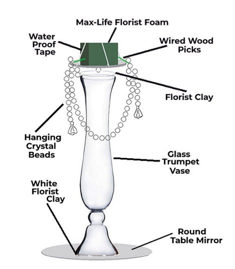 You have to take care that your arrangements are balanced. Fresh flowers and wet foam are heavy. I usually secure the base to a large table mirror with small, rolled pieces of white florist clay. This gives the vase a sturdy base that doesn't topple over at the slightest bump of the table by a wedding guests.