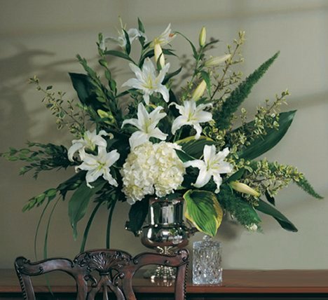 A wedding flower decoration for the front of a large church needs to be big to be impressive. That means you need to use big flowers! Oriental lilies and hydrangeas are perfect in this large spray, that also features a mix of greenery for a large, one-sided floral.