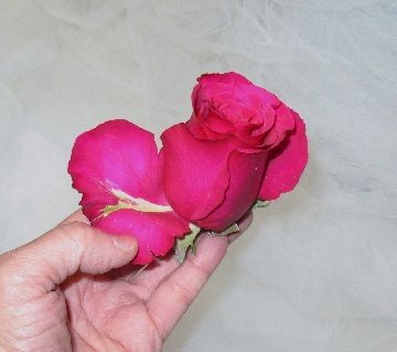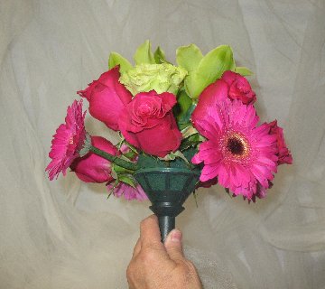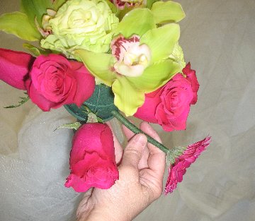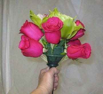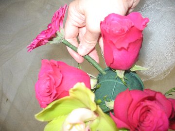 This wedding flowers bouquet is about to get really colorful by adding hot pink roses. I always remove the protective outer petals off the rose before inserting it into the bouquet holder. Always leave these petals on until you are ready to design, since they protect the inner petals from gouging and bruising.