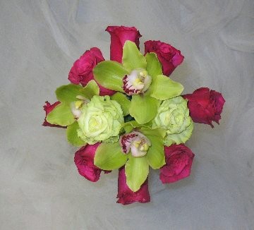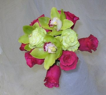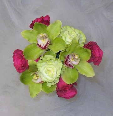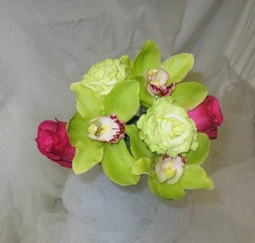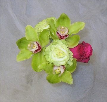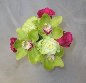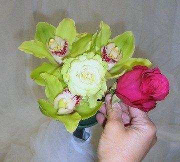 With above a 3" stem, insert the first pink rose clustered in tightly in a space next to the green rose and the cymbidium orchid.