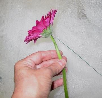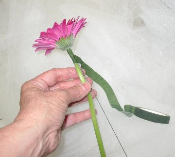 Tape the Gerbera daisies completely to the bottom of their stems, but do not seal off the bottom, as you want the flowers to be able to draw up moisture to their head from the foam. Gerbers are VERY water loving and should not be without moisture for very long or they will wilt quickly.