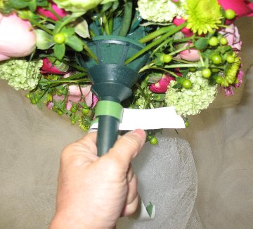 I wrap the handle of the bouquet holder with floral clay. The sticky clay allows the cut flower stems to be held in place right where you want them.
