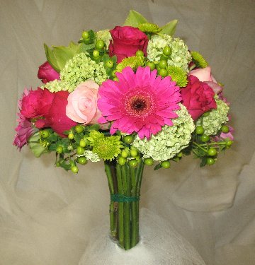A mock hand tied wedding bouquet has the look of a hand tied, but is much easier to design since foam allows you much more control of where each flower is placed.