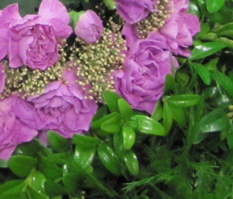 Take a close look at the lovely ring of carnations, rice flower, boxwood and then the darker green of the leather leaf fern. They are have a lovely contrast that simply pops with color.