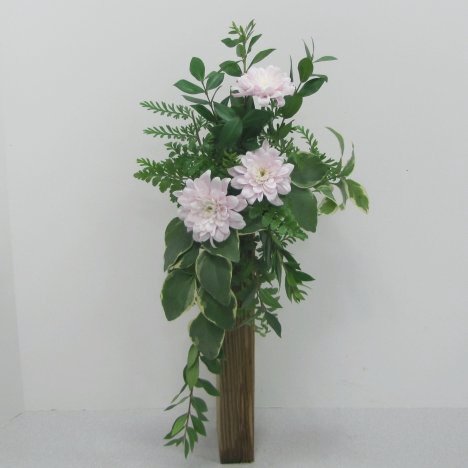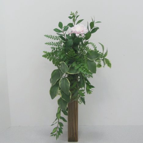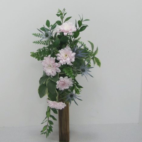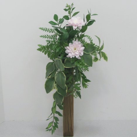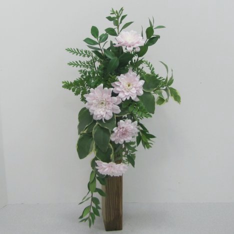 The point is that most greening steps are the same. What flowers and colors you add is totally up to you and your own wedding color palette. I'm going to quickly fill in with light pink chrysanthemums so you can see how different it can look with a different variety and pastels rather than the boldness of red.