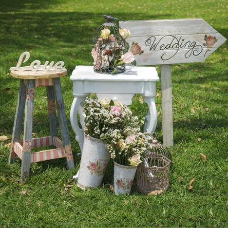 If your theme is casual, check out thrift stores for interesting props, such as stools, small tables, large vases, crates and other items that can be used as stands or tables. A wide selection of decorative sprays can change the colors. Beautiful muslin or jute ribbon can be wrapped and tied as bows.