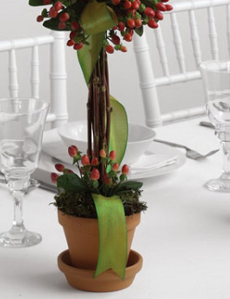 This wedding topiary centerpiece is quick and easy, using the flower stems as the supporting pole for the topiary. Hypericum berries come in different colors to match with your wedding decor. To create a similar look, you'll need the following fresh flowers and floral supplies: