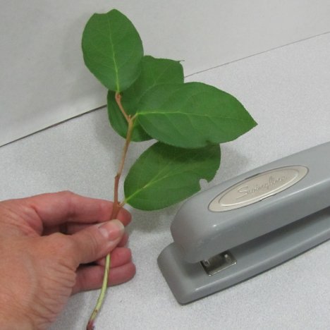 Believe it or not, florists actually use common desk staplers to make sure that leaves stay in place. You can use floral adhesive or florist clay, but I find a stapler faster and easier.