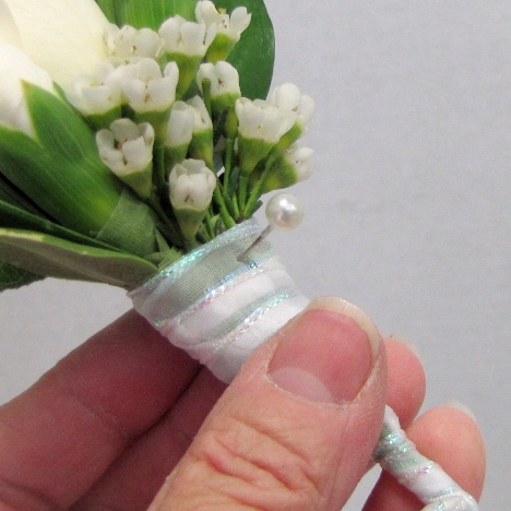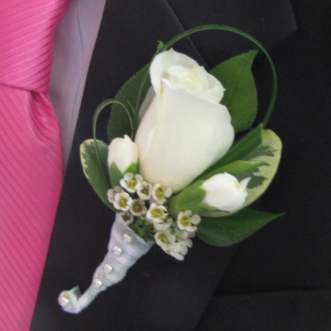 It's amazing how a simple white rose boutonniere turns into a work of art with the addition of some mixed greenery, a couple of carnation buds, wax flower and a lovely finished ribbon stem with pearls.