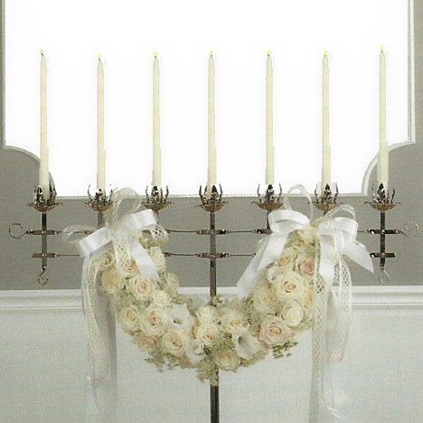 After delivery to church, slip the ribbons through the wired attachment, creating shoetie ribbons as shown in photo to attach to candelabra . It is wise to secure with taped wires as well, as the weight of the wreath can be rather heavy with the wet foam and the flower heads.