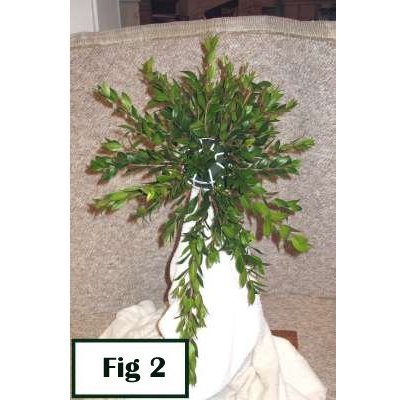 As you fill in, the myrtle begins to angle outward, then closer to the center until the middle is reached. There you shorten the myrtle stems and having them coming straight out from the center of the bouquet holder.