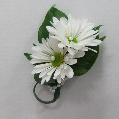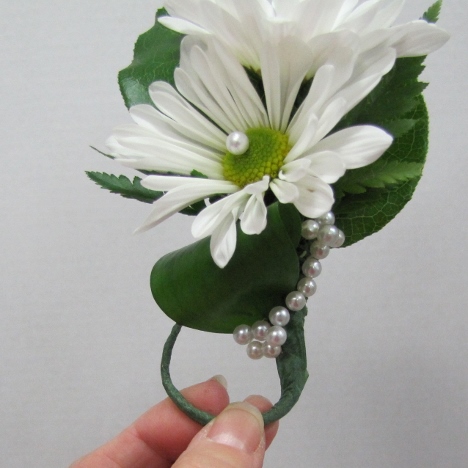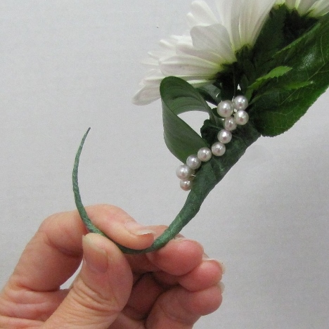 I'm tucking the end up under the Israeli Ruscus leaf that is folded under the bottom daisy head.