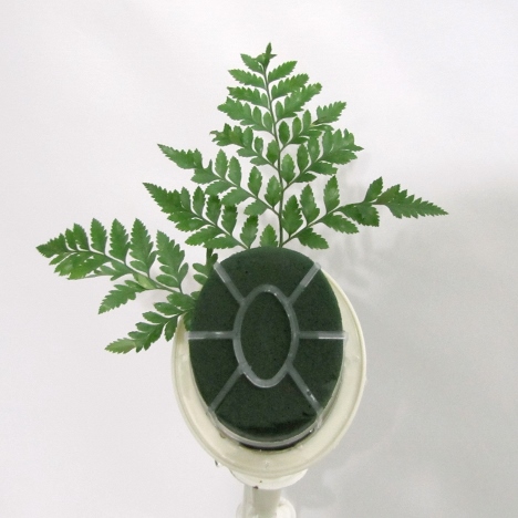 Begin by inserting your cut off leather leaf fronds (about 4" - 5" long) around the perimeter of the bridal bouquet foam. Remember that this frame of greens is going to dictate how large your final white rose bouquet will be. The lower fronds that you cut off these first pieces can later be used to fill in the center of the holder.