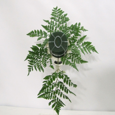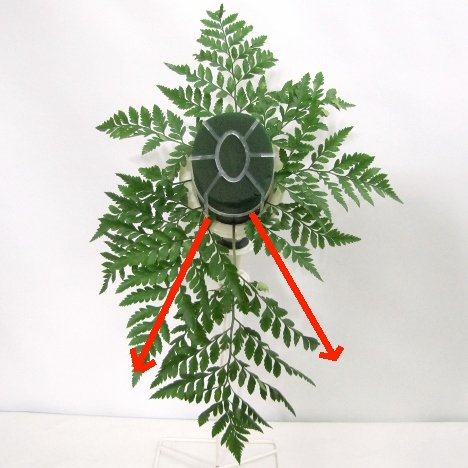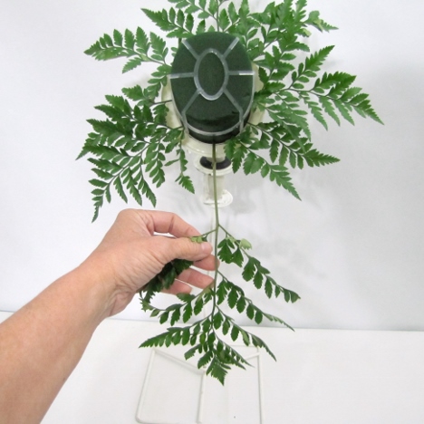 Then insert a longer piece of leather leaf fern. Remember - the length of the greenery dictates how long the cascade will be.