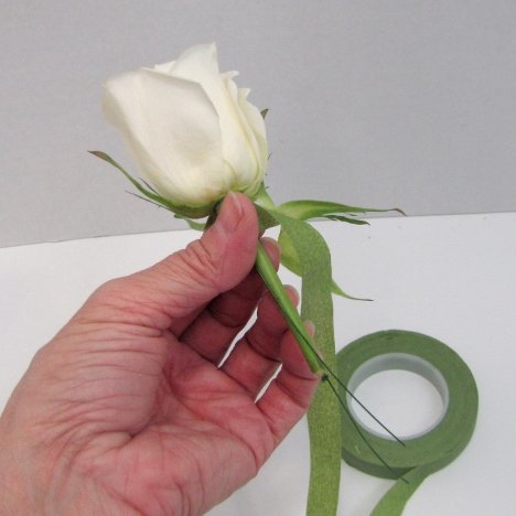 Corsage stem wrap is a product that will stretch and cling to itself, forming a tight bond around flower stems. Using green tape, start at the top of the flower and cover the wire with tape.