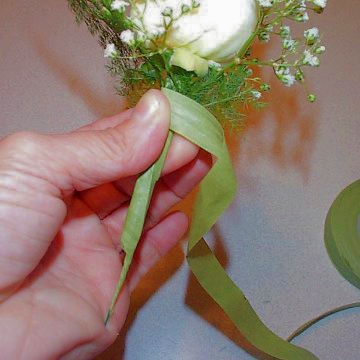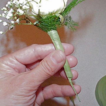 Tape feathery greenery (this is plumosa) to the back of the corsage.