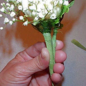 Wrap corsage tape and stretching so it clings firmly to the stem of the corsage.