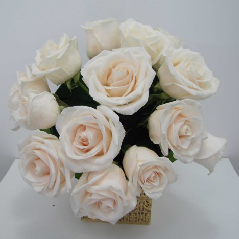 I've now inserted 14 roses, all in a open state. Note how the top roses face upwards, the middle roses angle outward, and the face of the roses on the outer edge of the bouquet are completely lateral.