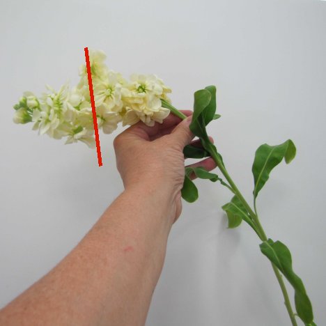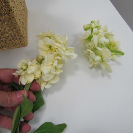 The roses are the primary focal flowers and the stock is the secondary. Thus I'm cutting the head into two lengths so I can tuck the blooms in between the flowers.