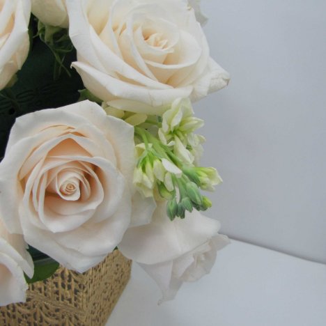 This white rose bridal bouquet is fast gaining it's round shape. You may need to shorten the stems of the outer roses (opposite of what you would do with a Belle bouquet holder) in order not to creating an over large bouquet.