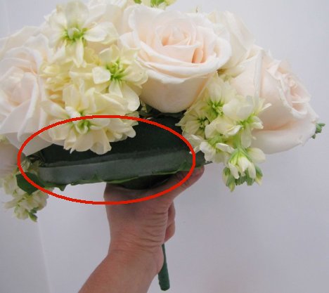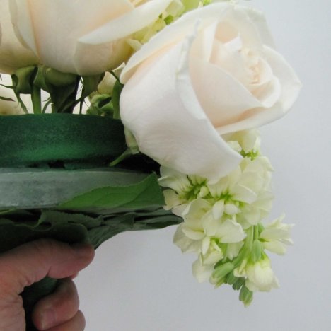 Pay attention to the sides of the bouquet. Remember - on your initial walk down the aisle most of your guests are going to see your flowers from the side. Be sure to use the secondary and filler flowers to hide the sides of the holder.