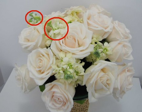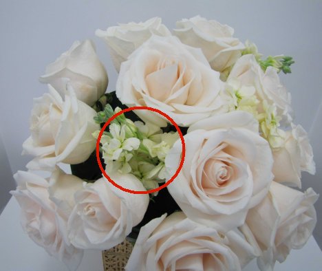 This natural draping of the stock flower can also be used to advantage of concealing the foam edge of the bouquet holder. Covering your basic mechanics should always be considered in every flower design.