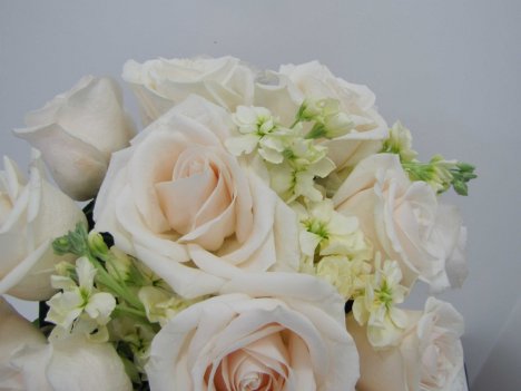 I continue to fill out this bridal bouquet with more cream stock. See how cutting the stalks in half give different textures to the design.