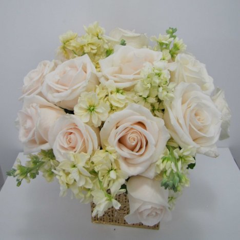 I chose a creamy ivory colored stock for this bouquet, since the bride's gown has a definite golden cast to it. The green tones is mixed in with all stock colors as the nature of the flower.
