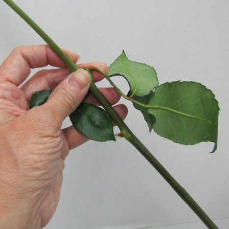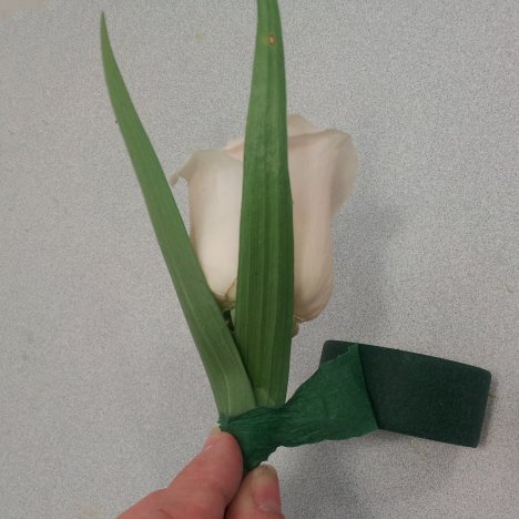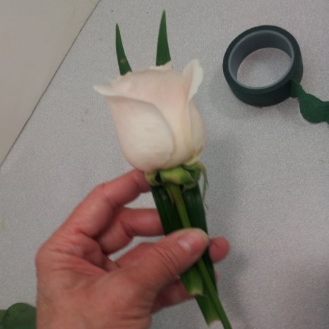 Place two blades of grass behind the rose head, extending them above the head of the rose. Cup the two blades of grass around the stem, bending them in place, before securing with floral tape.