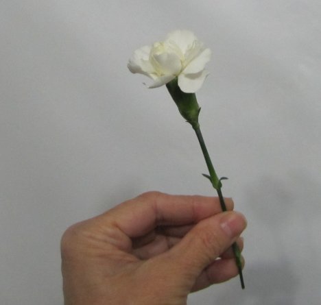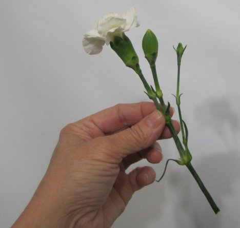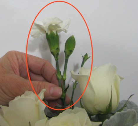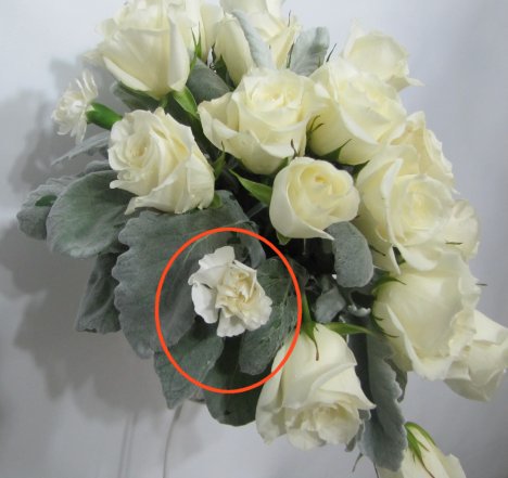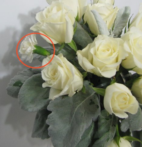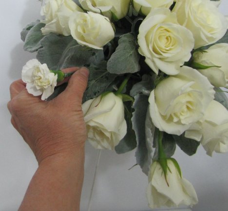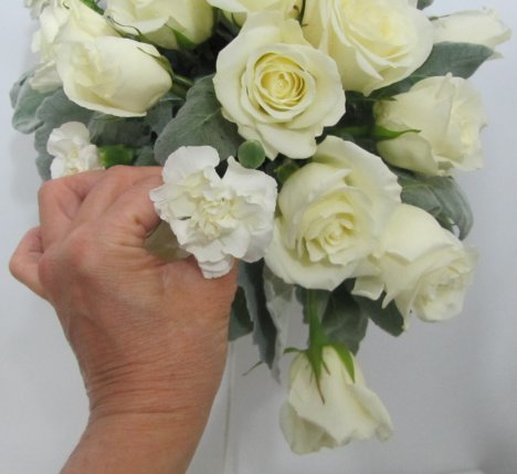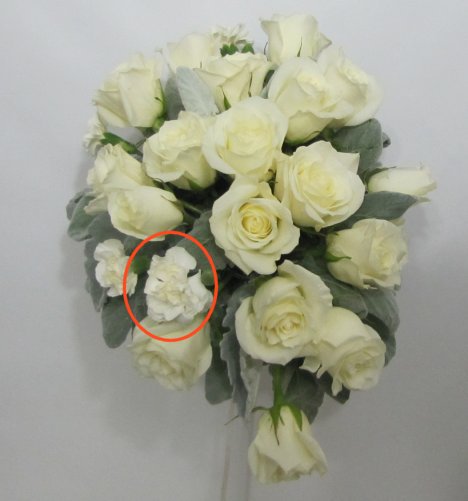 Note the placement of this miniature carnation on the right hand side upper portion of the bouquet.